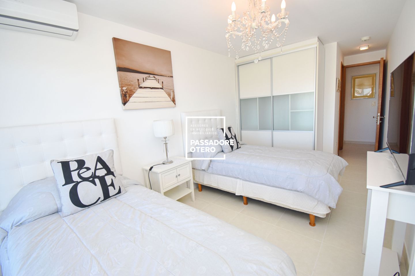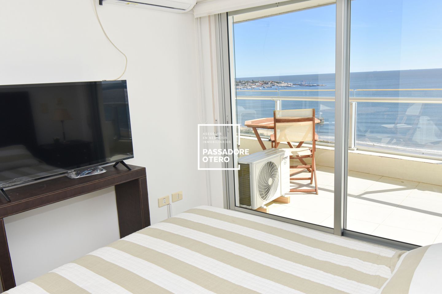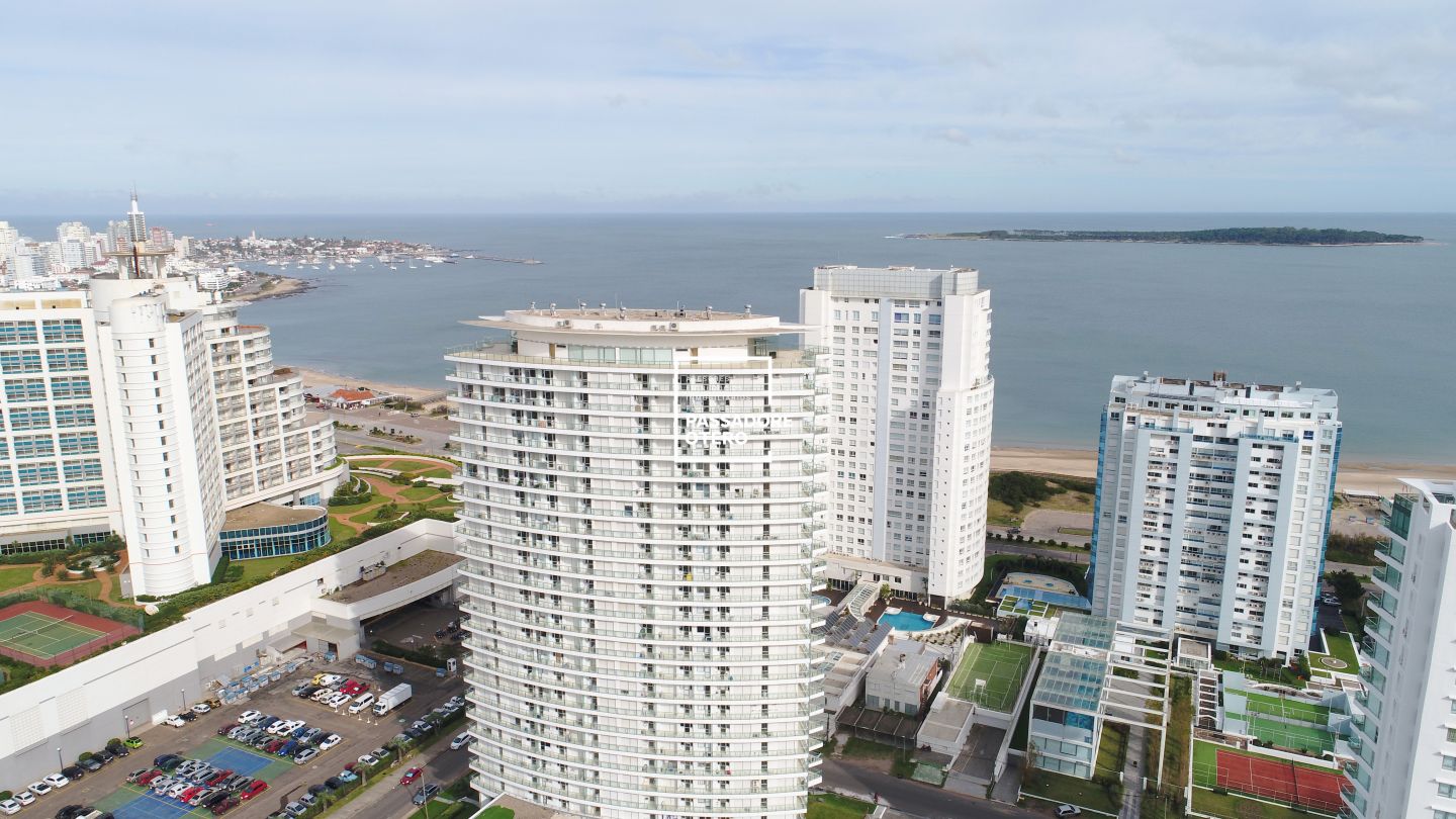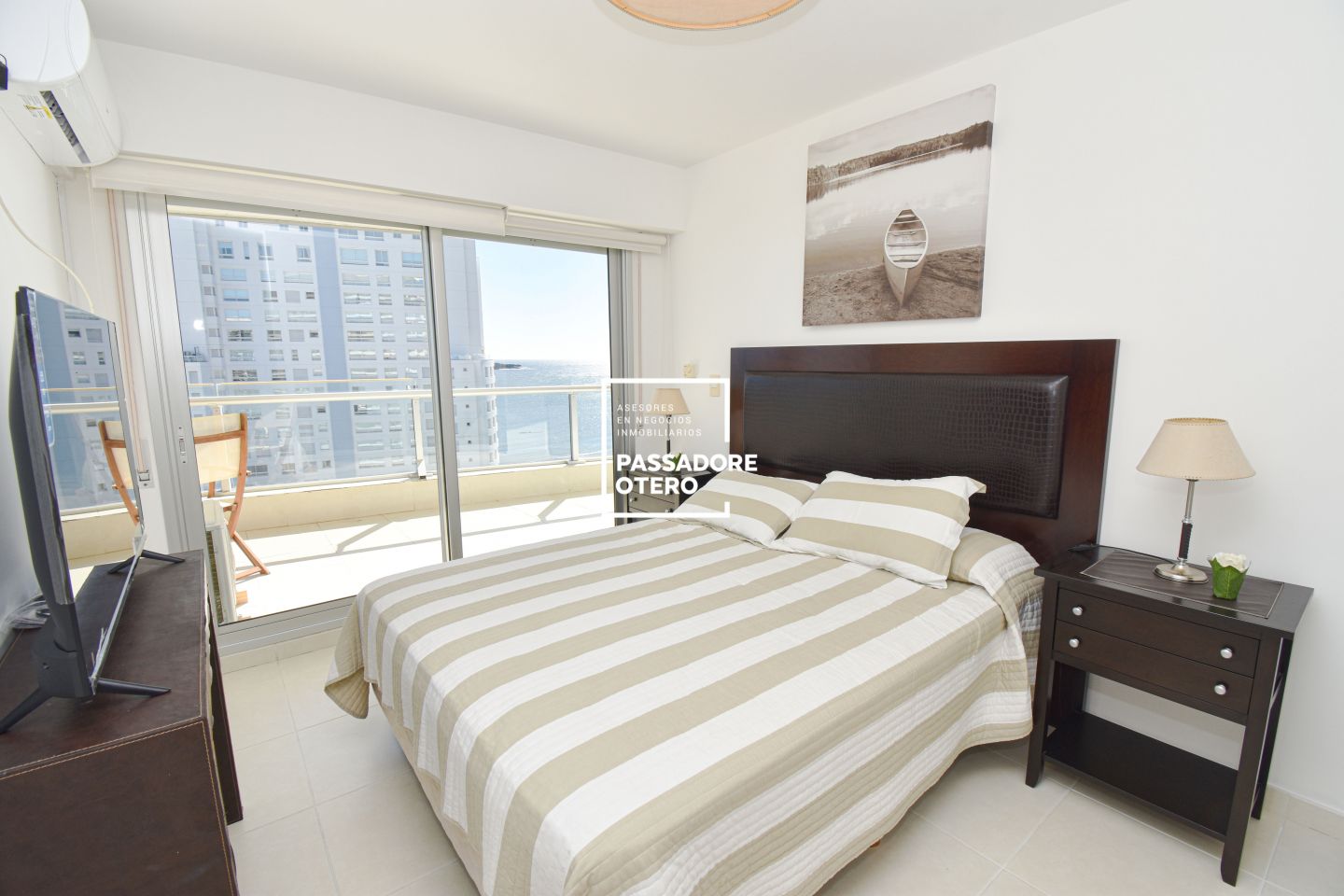 ALQUILER TEMPORADA.En la parada 4 de la Playa Mansa, al lado de Hotel Enjoy, con excelente vista al puerto, a la bahía, a Playa Brava y al bosque. Unidad de dos dormitorios, todos en suite, hidromasaje en suite principal, mas baño social, amplios placares. Espacio living-comedor integrado al balcón terraza con vista panorámica. Una cocina definida con salida a terraza con vista a playa brava. Calefacción por losa radiante y aire acondicionado. El mejor SPA para tus sentidos y pensado para ti, con sauna humedo y seco, hidromasaje, ducha, salas de masajes, de relax, gimnasio, cancha de tenis, piscina cerrada y abierta. Servicio de mucama, servicio de playa, sala de juegos para niños y adolescentes. Se destacan parrilleros de uso comun en ultimo piso con increibles vistas panoramicas!!.Recepcion las 24 horas.Precio publicado corresponde al valor diario en baja ocupación*