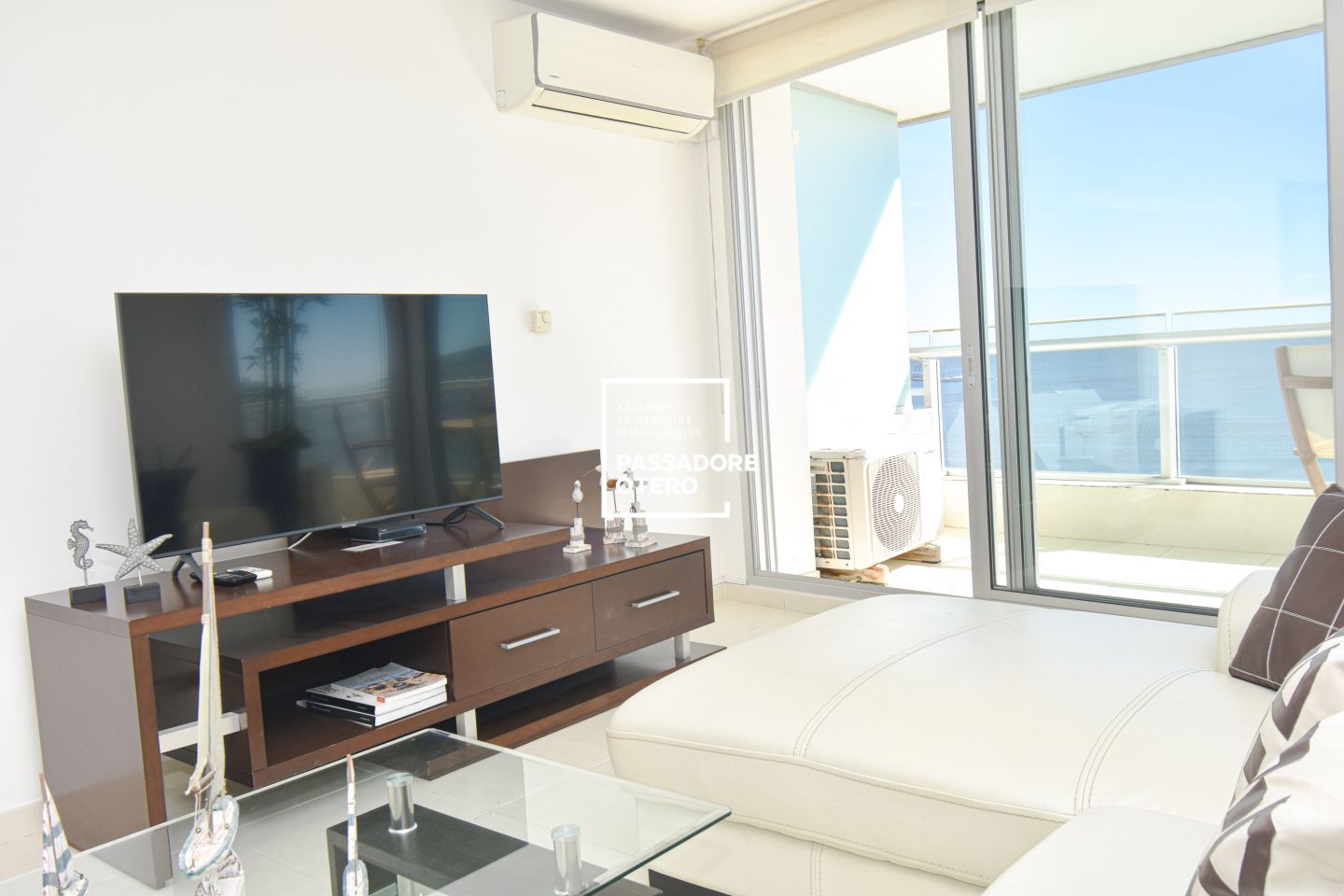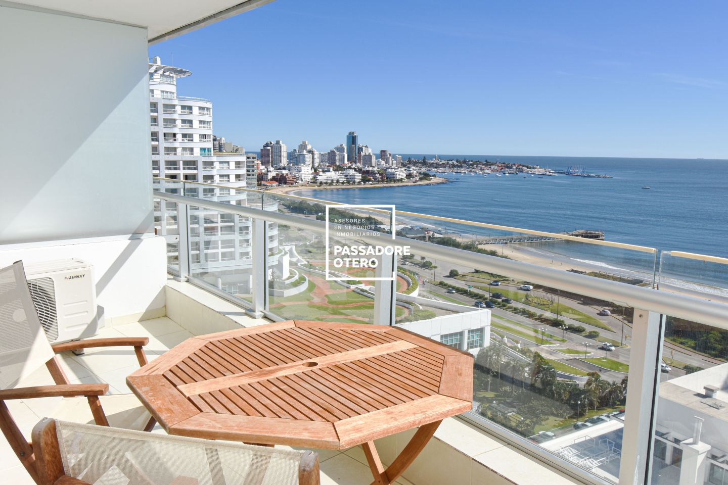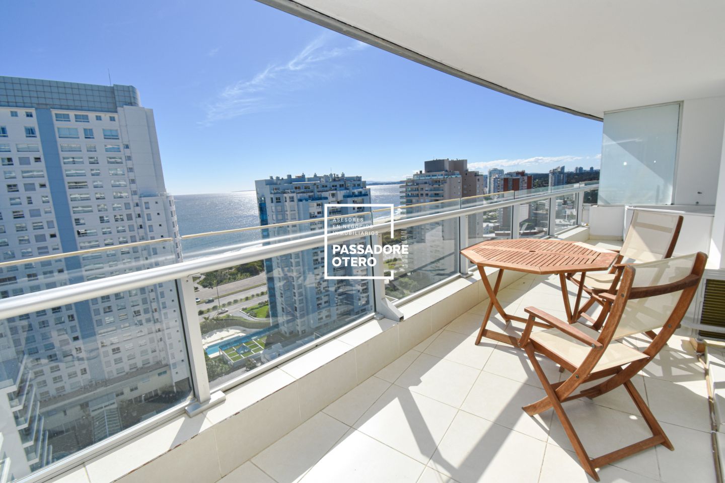 ALQUILER TEMPORADA.En la parada 4 de la Playa Mansa, al lado de Hotel Enjoy, con excelente vista al puerto, a la bahía, a Playa Brava y al bosque. Unidad de dos dormitorios, todos en suite, hidromasaje en suite principal, mas baño social, amplios placares. Espacio living-comedor integrado al balcón terraza con vista panorámica. Una cocina definida con salida a terraza con vista a playa brava. Calefacción por losa radiante y aire acondicionado. El mejor SPA para tus sentidos y pensado para ti, con sauna humedo y seco, hidromasaje, ducha, salas de masajes, de relax, gimnasio, cancha de tenis, piscina cerrada y abierta. Servicio de mucama, servicio de playa, sala de juegos para niños y adolescentes. Se destacan parrilleros de uso comun en ultimo piso con increibles vistas panoramicas!!.Recepcion las 24 horas.Precio publicado corresponde al valor diario en baja ocupación*
