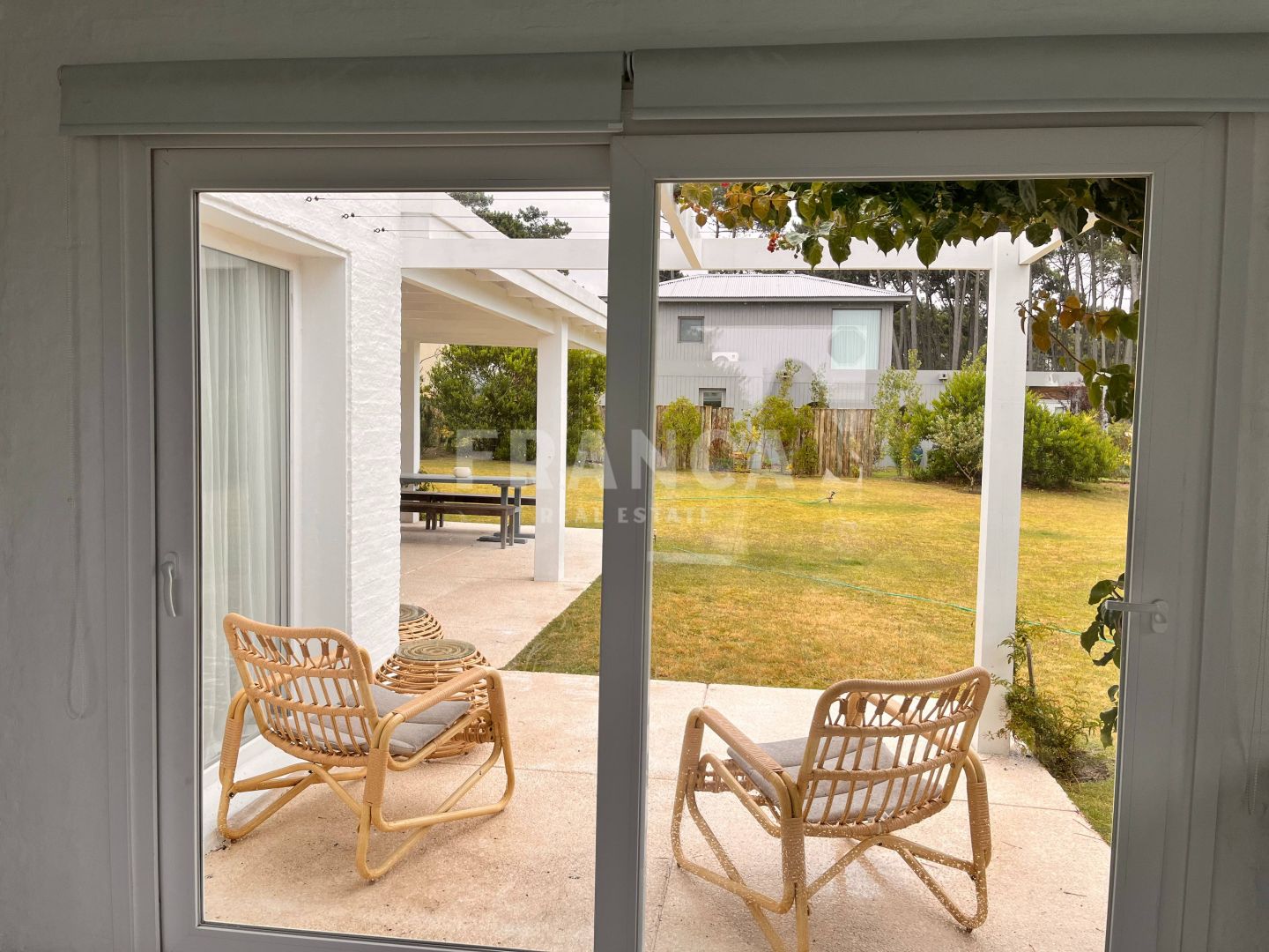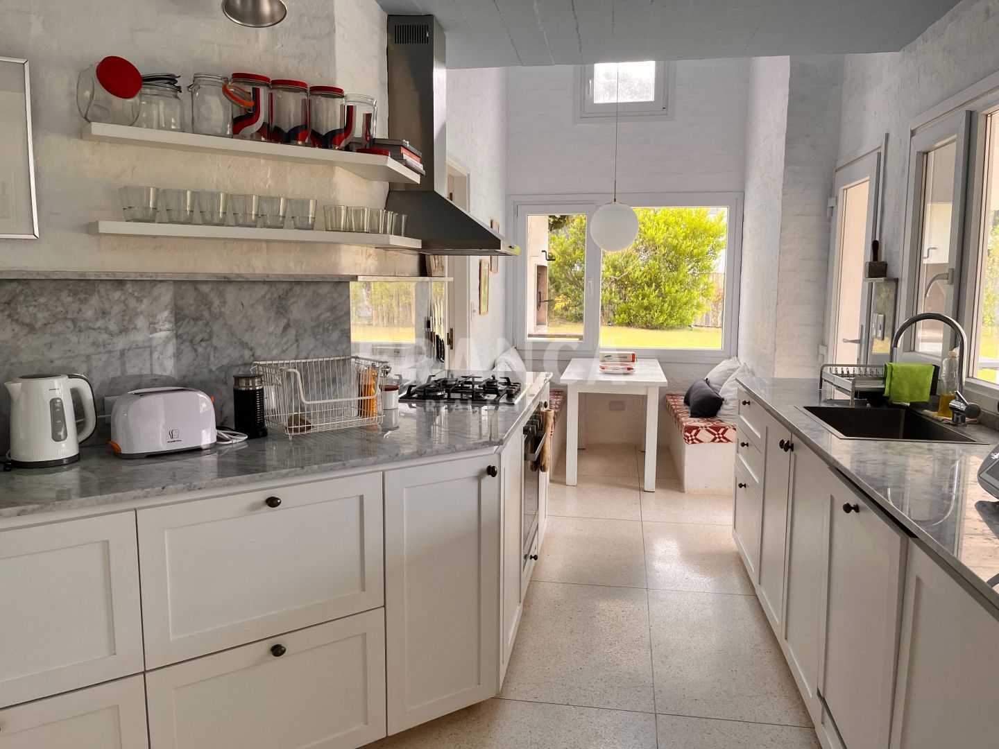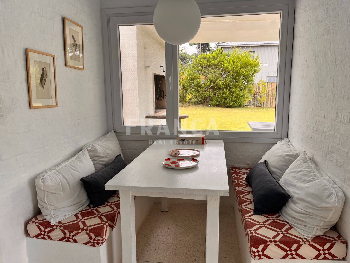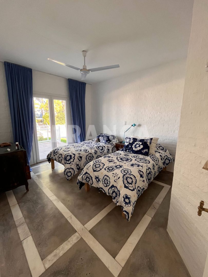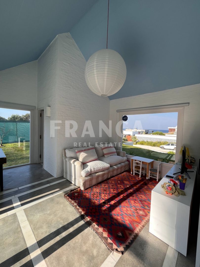 Alquiler temporario de Casa en Laguna Blanca, Manantiales.Amplia propiedad en el exclusivo barrio cerrado Laguna Blanca, ubicada en un terreno elevado, con una hermosa vista al mar desde su terraza.Esta cálida casa tiene tres habitaciones y tres baños. La suite principal ocupa la planta alta, mientras que las dos habitaciones adicionales se encuentran en la planta baja. La zona de estar y comedor se integra de manera armoniosa con la terraza, brindando vistas espectaculares al mar.Cuenta también con un playroom el cual puede convertirse en otro dormitorio y una habitación de servicio con baño independiente.El amplio jardín cuenta con un sector de parrilla techado con entrada directa a la casa.Cuenta con servicio de vigilancia 24 hs.