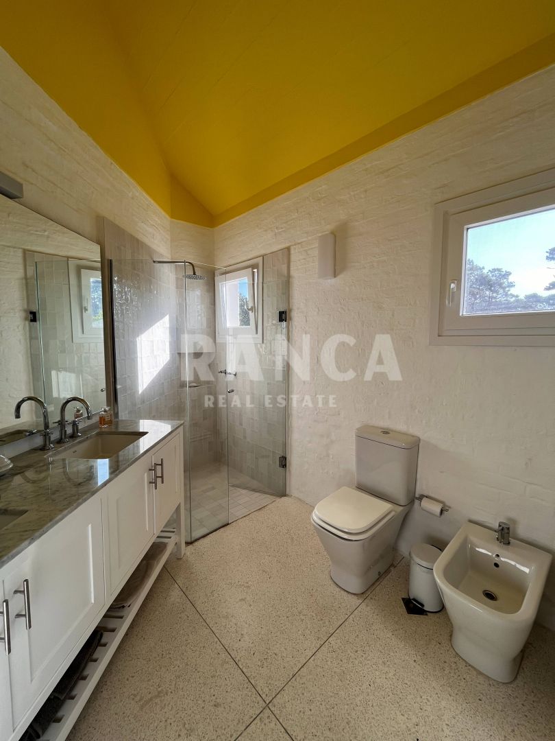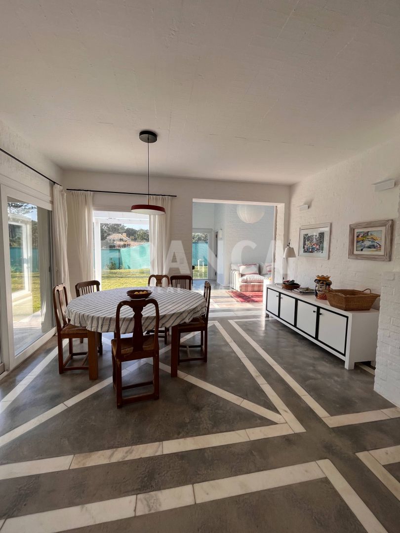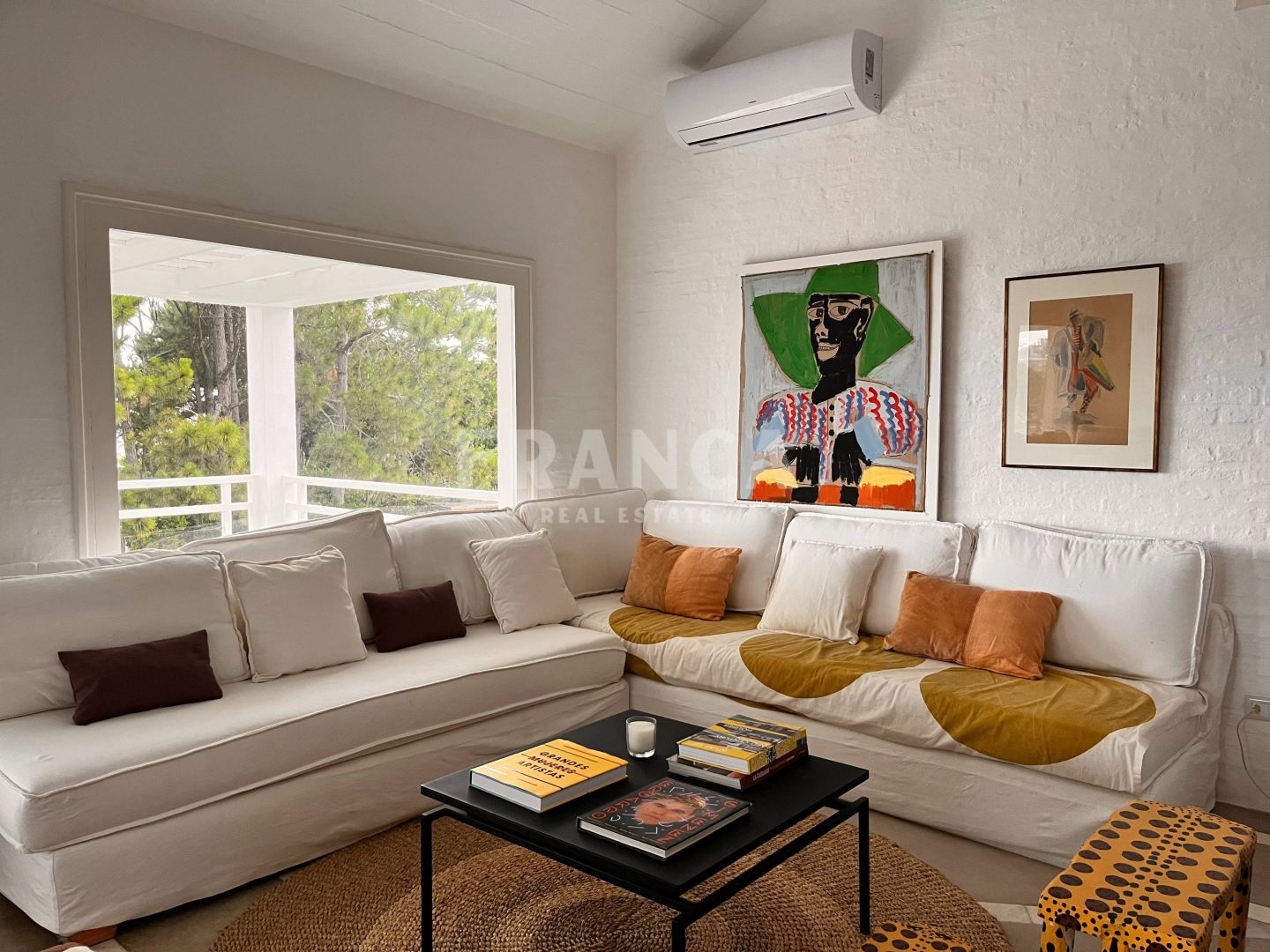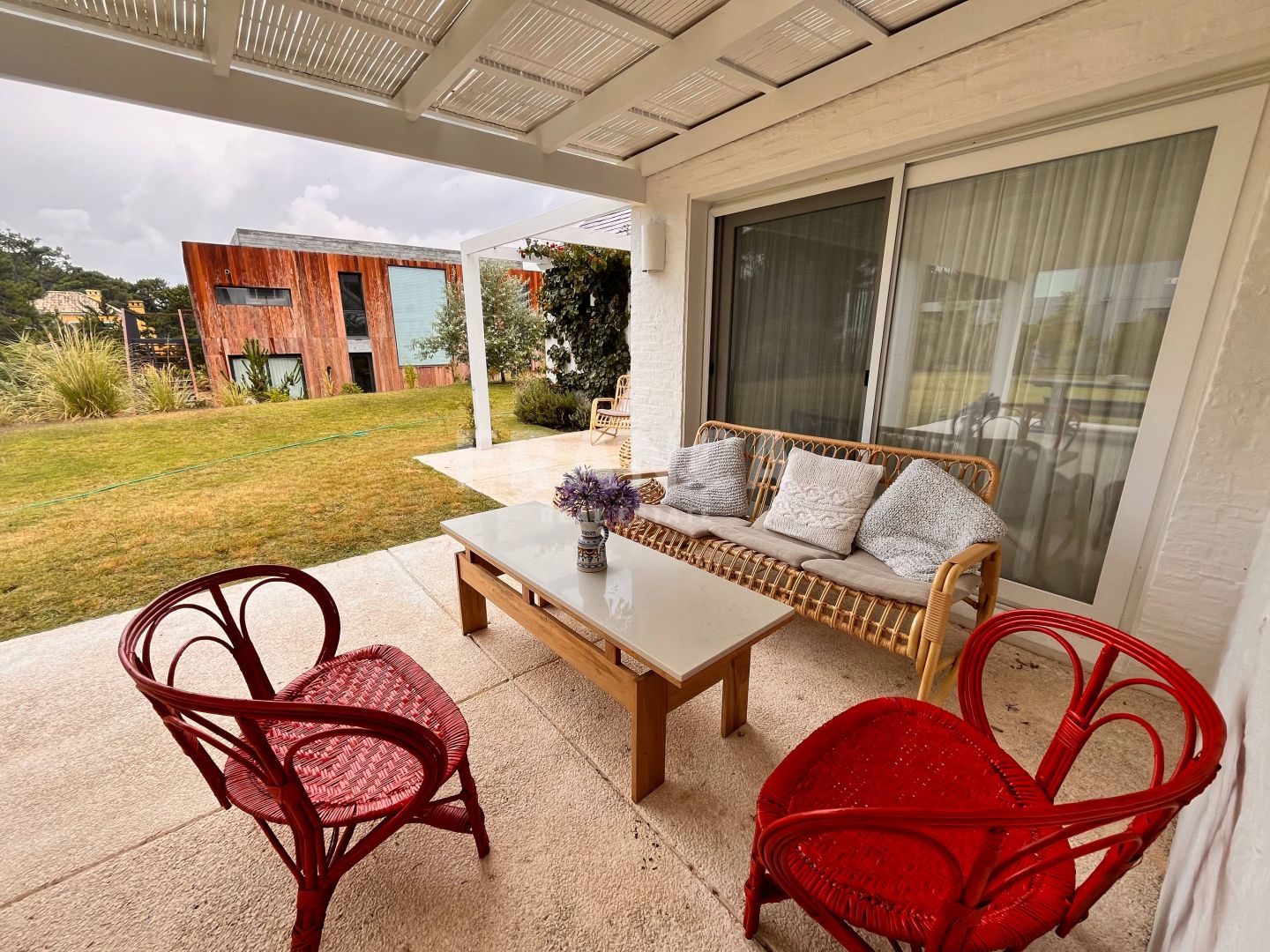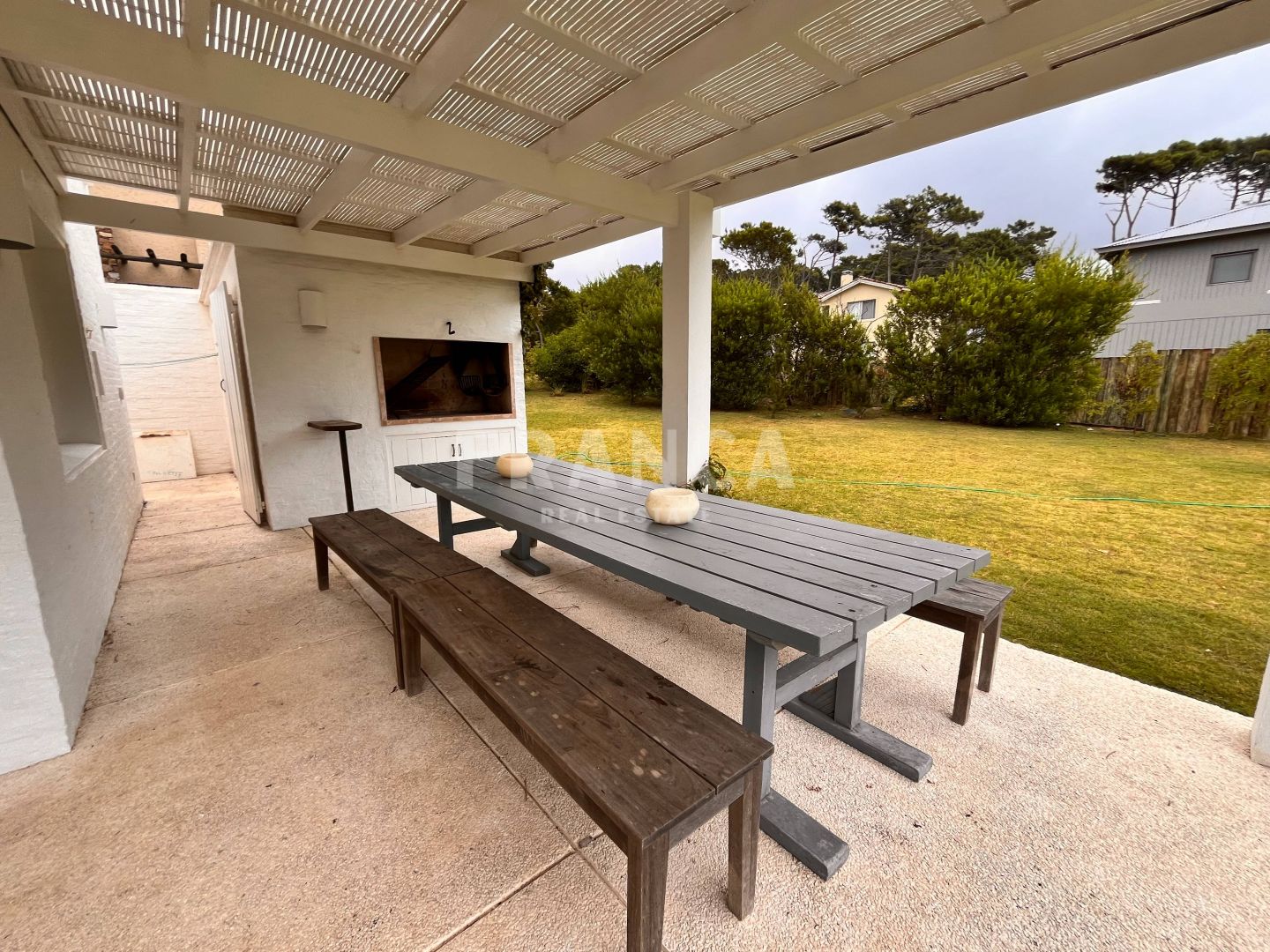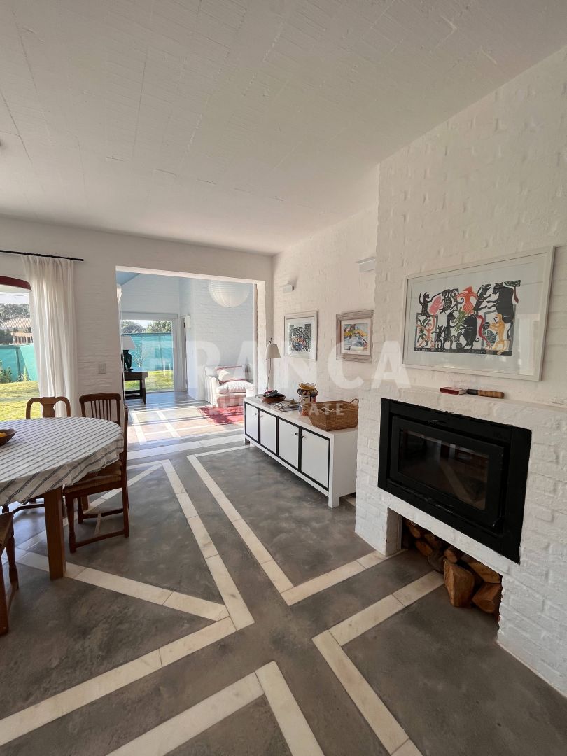Alquiler temporario de Casa en Laguna Blanca, Manantiales.Amplia propiedad en el exclusivo barrio cerrado Laguna Blanca, ubicada en un terreno elevado, con una hermosa vista al mar desde su terraza.Esta cálida casa tiene tres habitaciones y tres baños. La suite principal ocupa la planta alta, mientras que las dos habitaciones adicionales se encuentran en la planta baja. La zona de estar y comedor se integra de manera armoniosa con la terraza, brindando vistas espectaculares al mar.Cuenta también con un playroom el cual puede convertirse en otro dormitorio y una habitación de servicio con baño independiente.El amplio jardín cuenta con un sector de parrilla techado con entrada directa a la casa.Cuenta con servicio de vigilancia 24 hs.